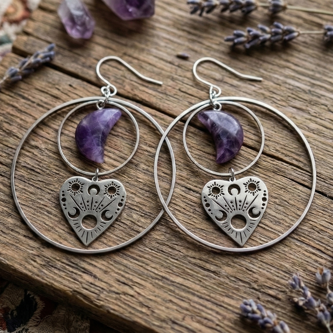 Amethyst Moon Ouija Planchette Earrings in Stainless Steel