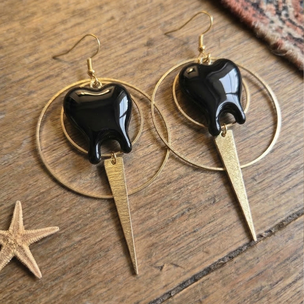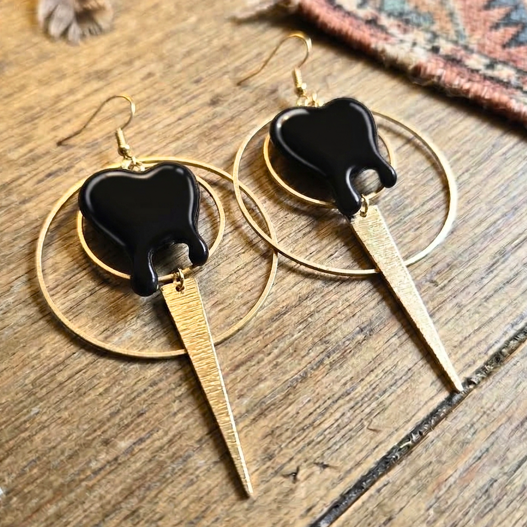 Black Drip Heart Statement Earrings – Raw Brass & 18K Gold Accents