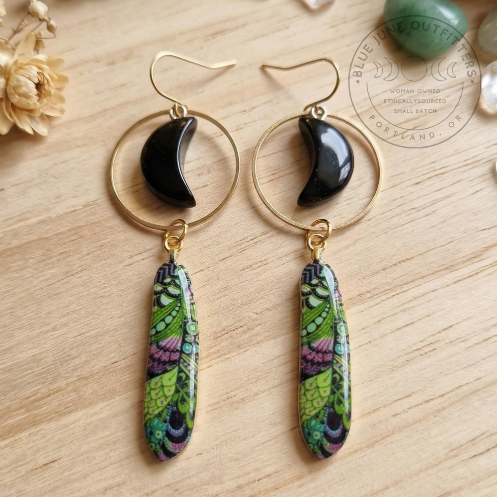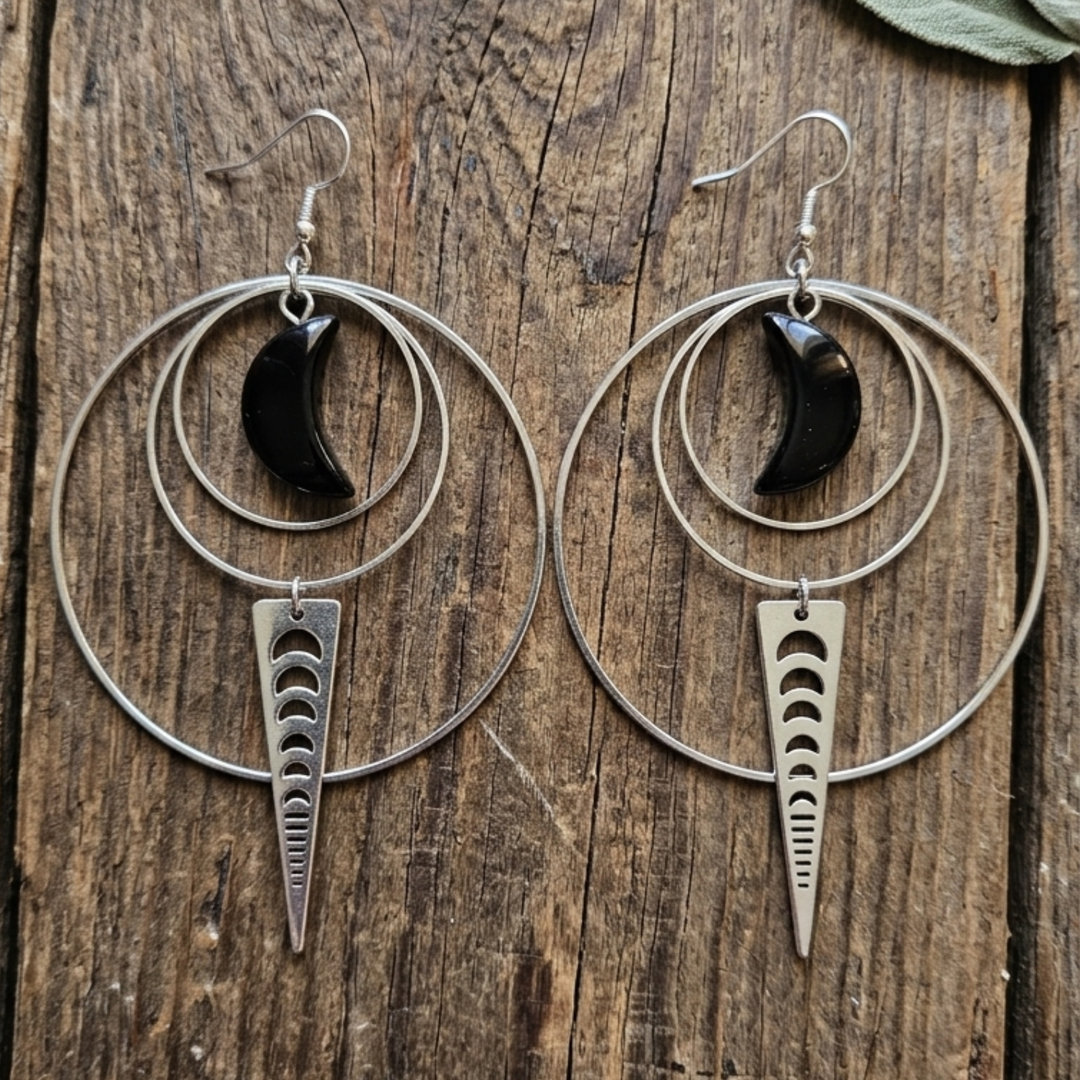 Celestial Moon Phase Hoop Earrings with Black Obsidian