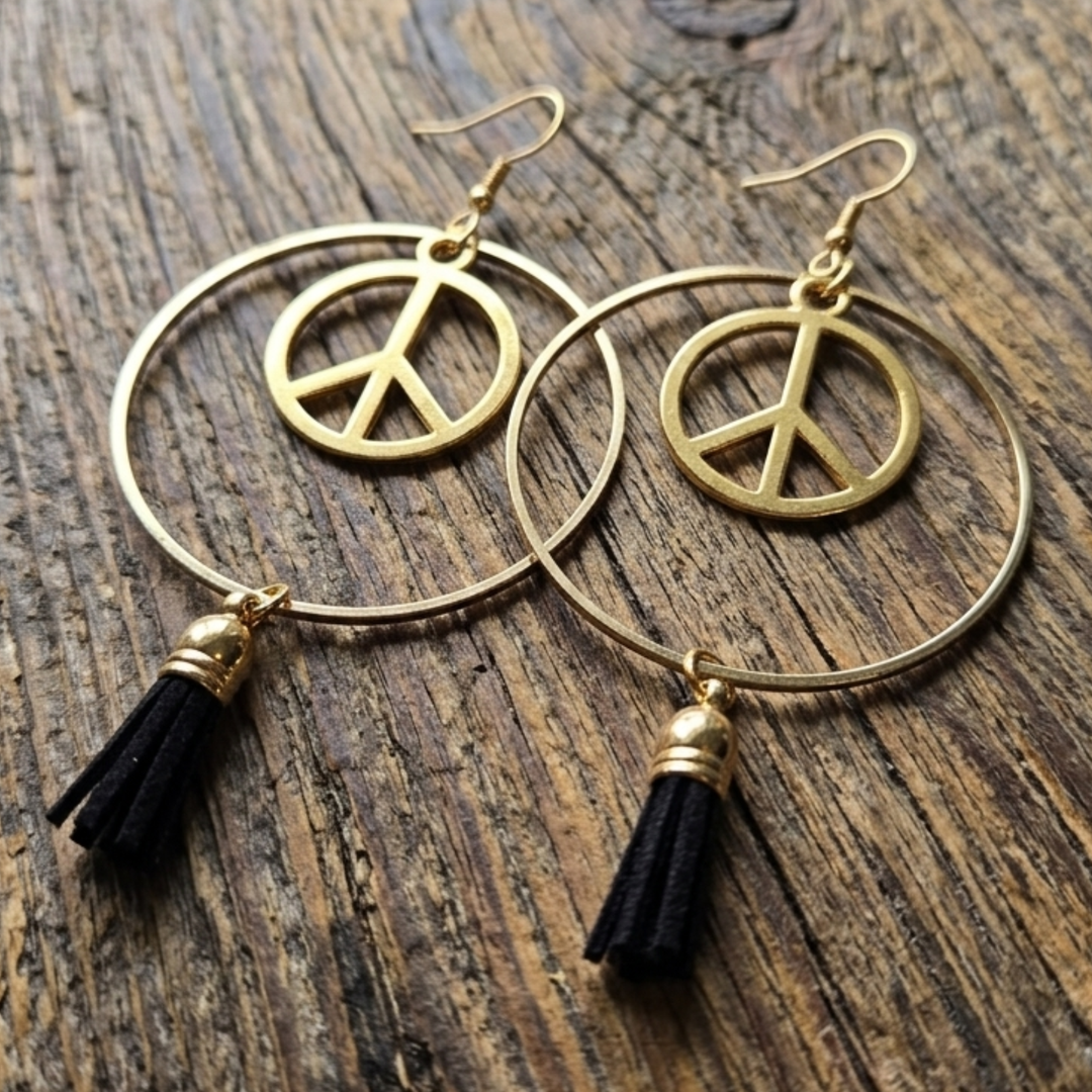 Boho Peace Sign Hoop Earrings with Black Tassels