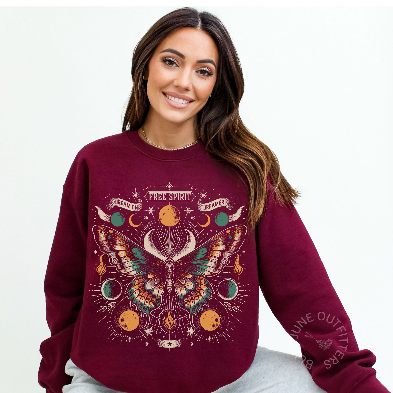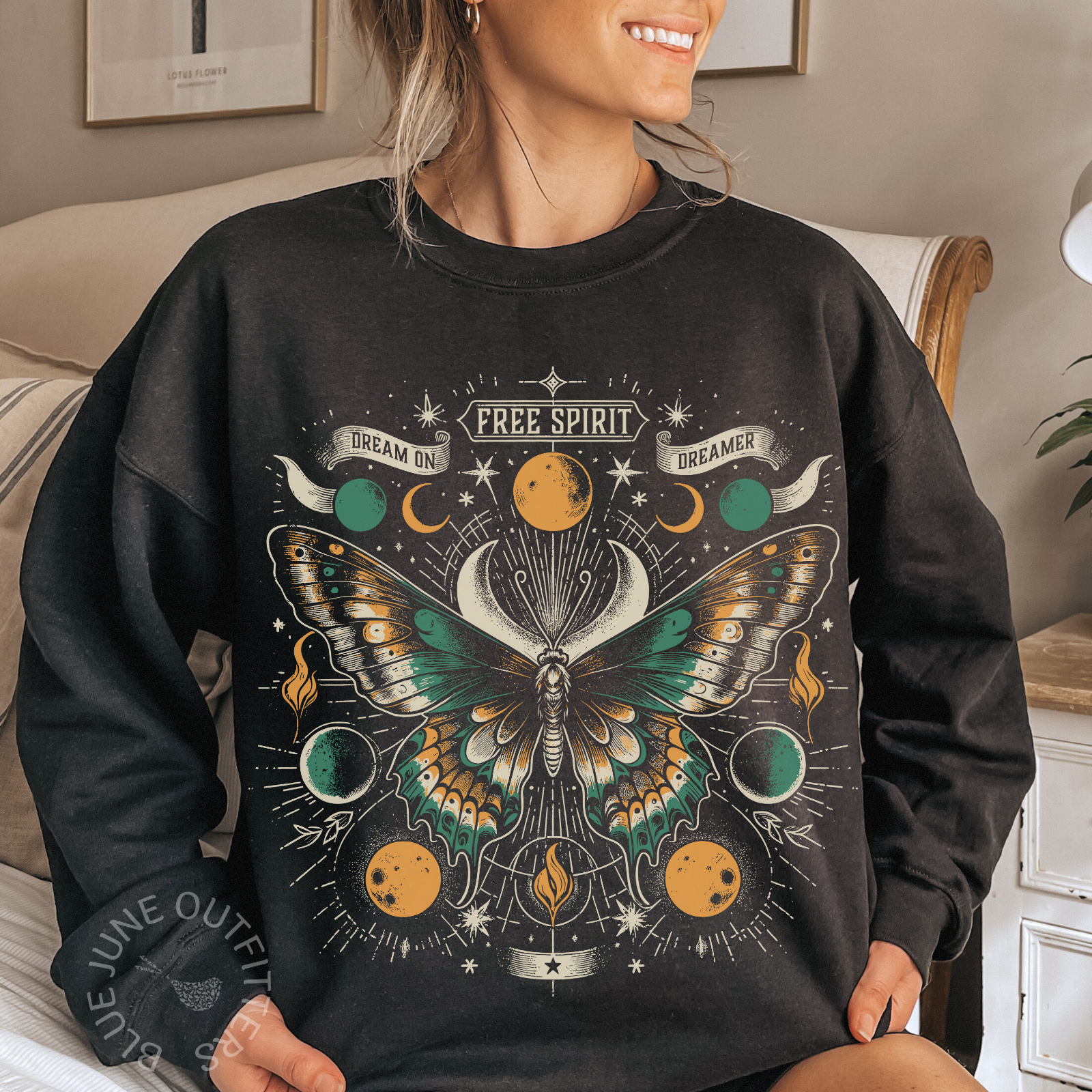 Stay cozy while embracing your bohemian, mystical vibes with our Free Spirit Celestial Sweatshirt. Featuring an enchanting sun, moon, and star design, this boho graphic sweatshirt is perfect for anyone drawn to the cosmos, astrology, and celestial style.