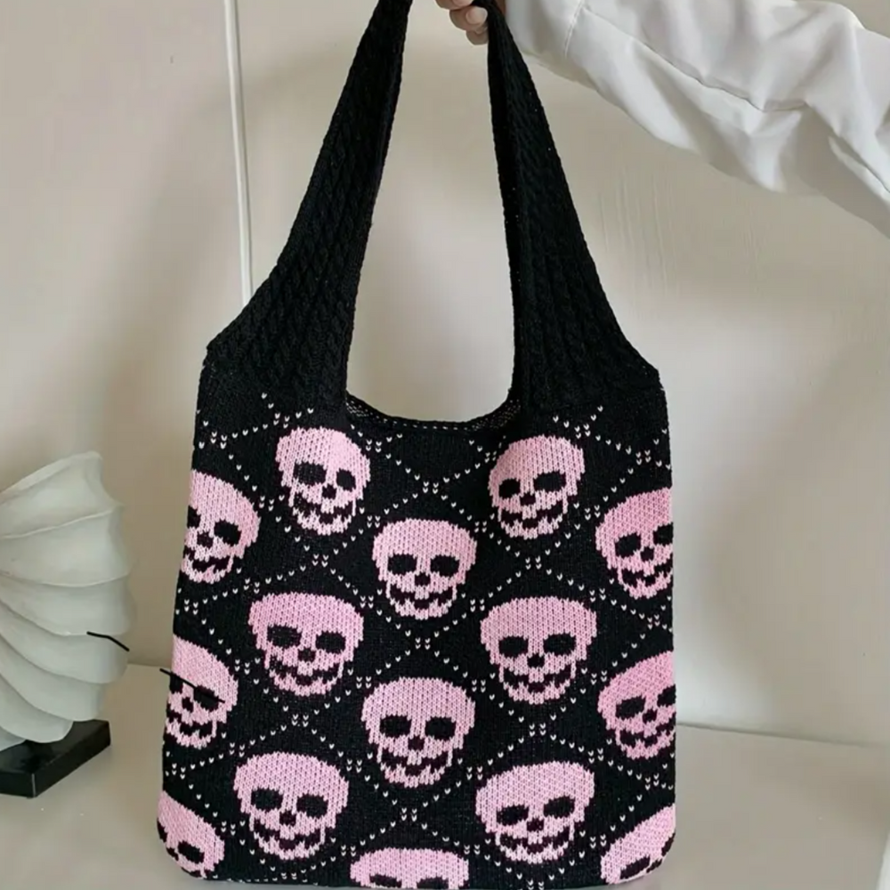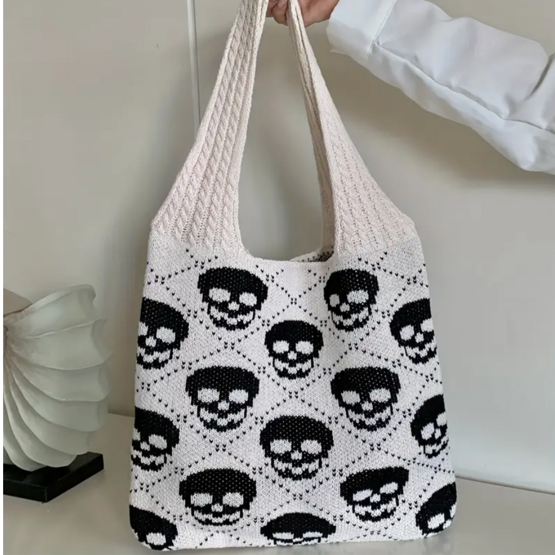Knitted Skull Tote Bag | Gothic Punk Shoulder Purse | Y2K Soft Knit Grunge Gift