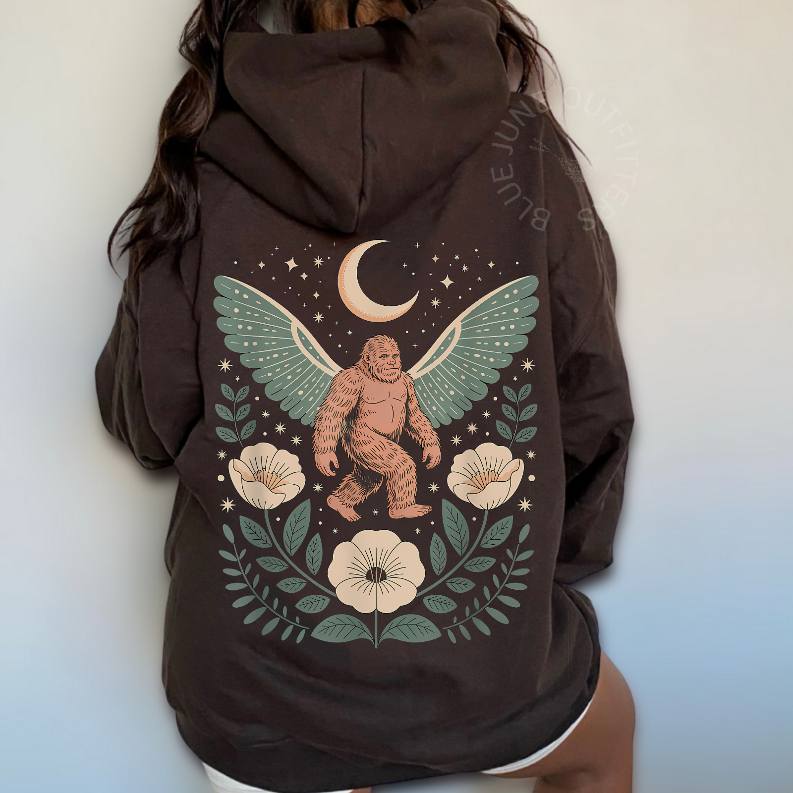 Embrace cryptid magic and cozy comfort with our Winged Bigfoot Gildan Hoodie. This one-of-a-kind design features a celestial Sasquatch with mystical moth wings beneath a glowing crescent moon, framed by flowers and stars. The ultimate mix of folklore fashion, witchy vibes, and cryptid streetwear, this hoodie is perfect for believers, festival-goers, and lovers of mythical creatures.