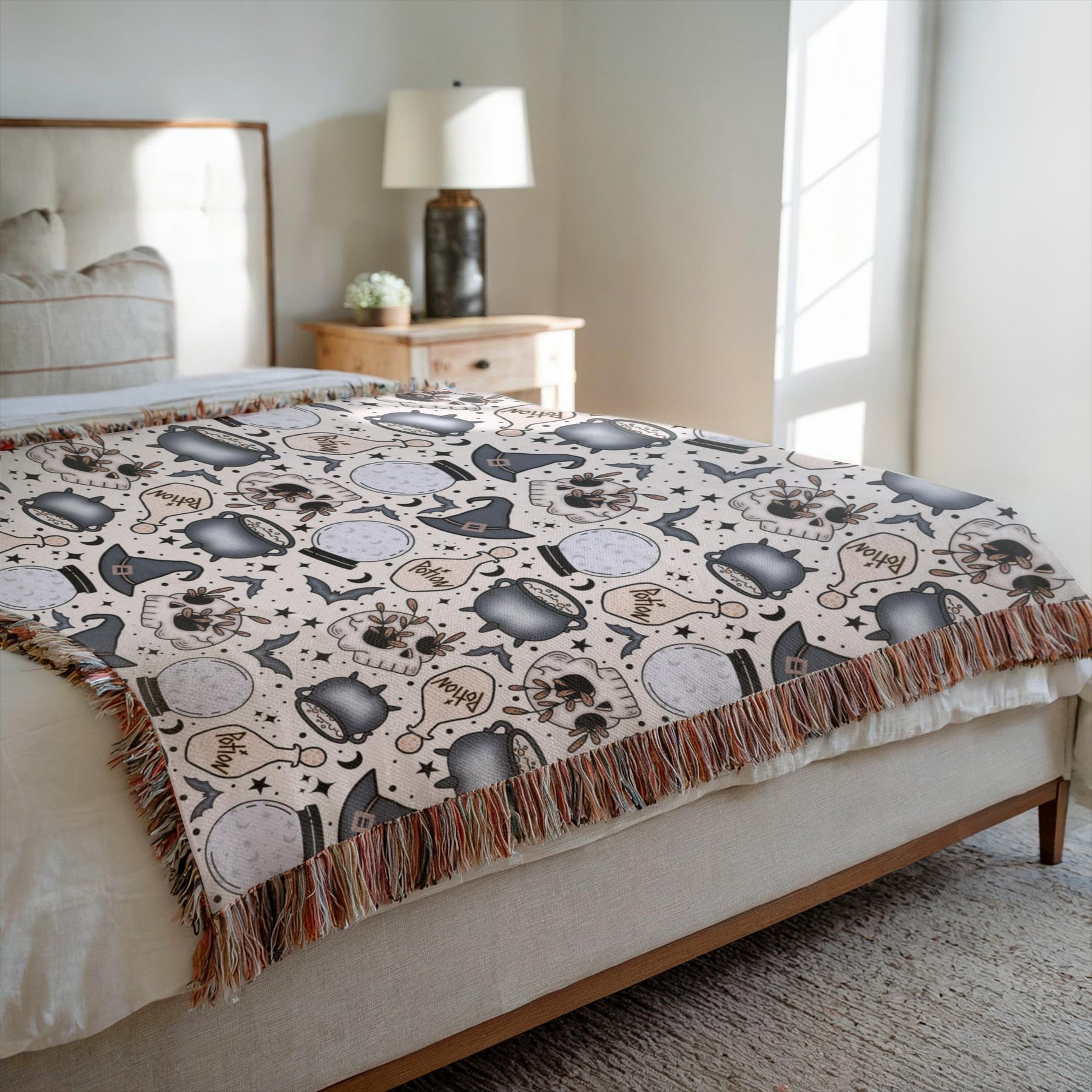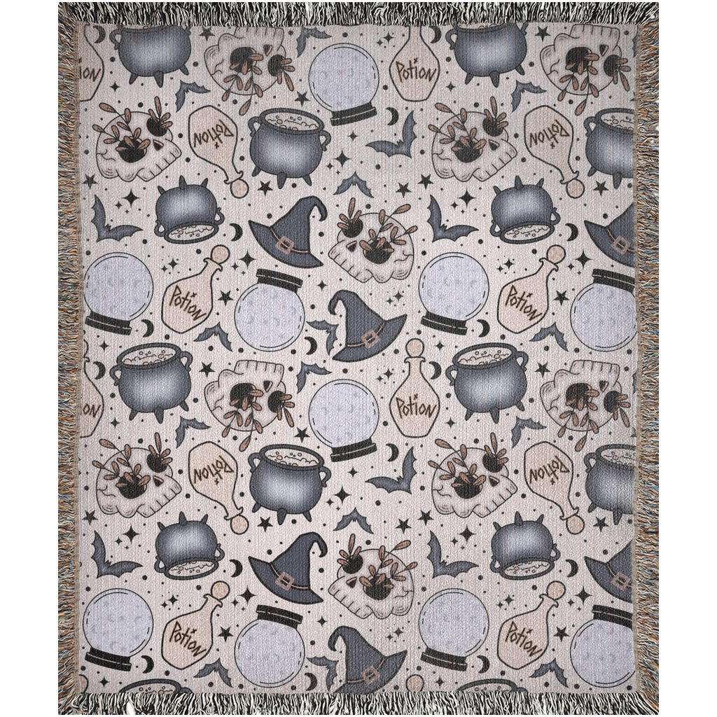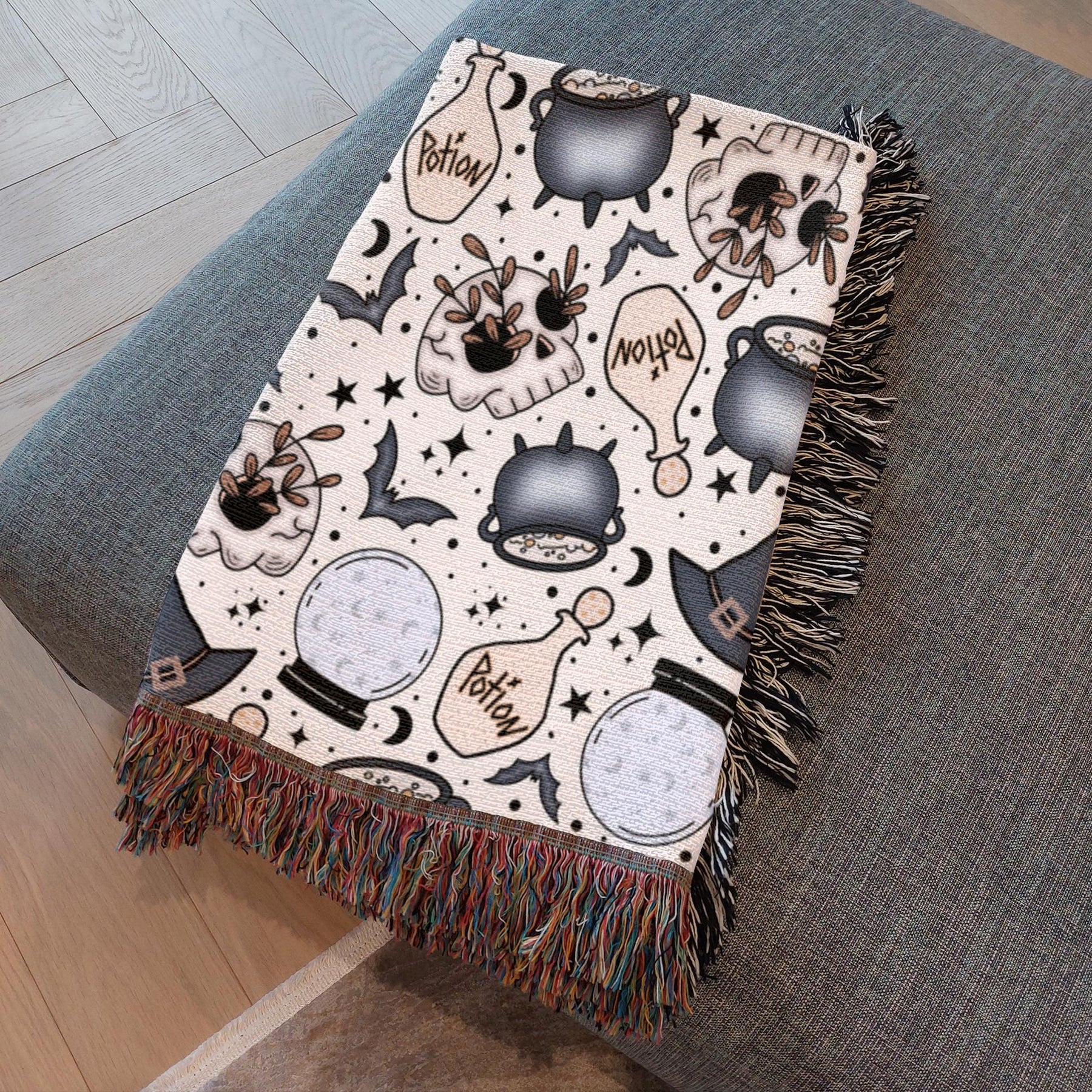 Add a dash of magic to your space with this 50” x 60” woven cotton blanket featuring playful illustrations of potions, bubbling cauldrons, fluttering bats, tiny skulls, and other cute witchy treasures. Whimsical and cozy, this design blends spooky charm with sweet, storybook vibes.